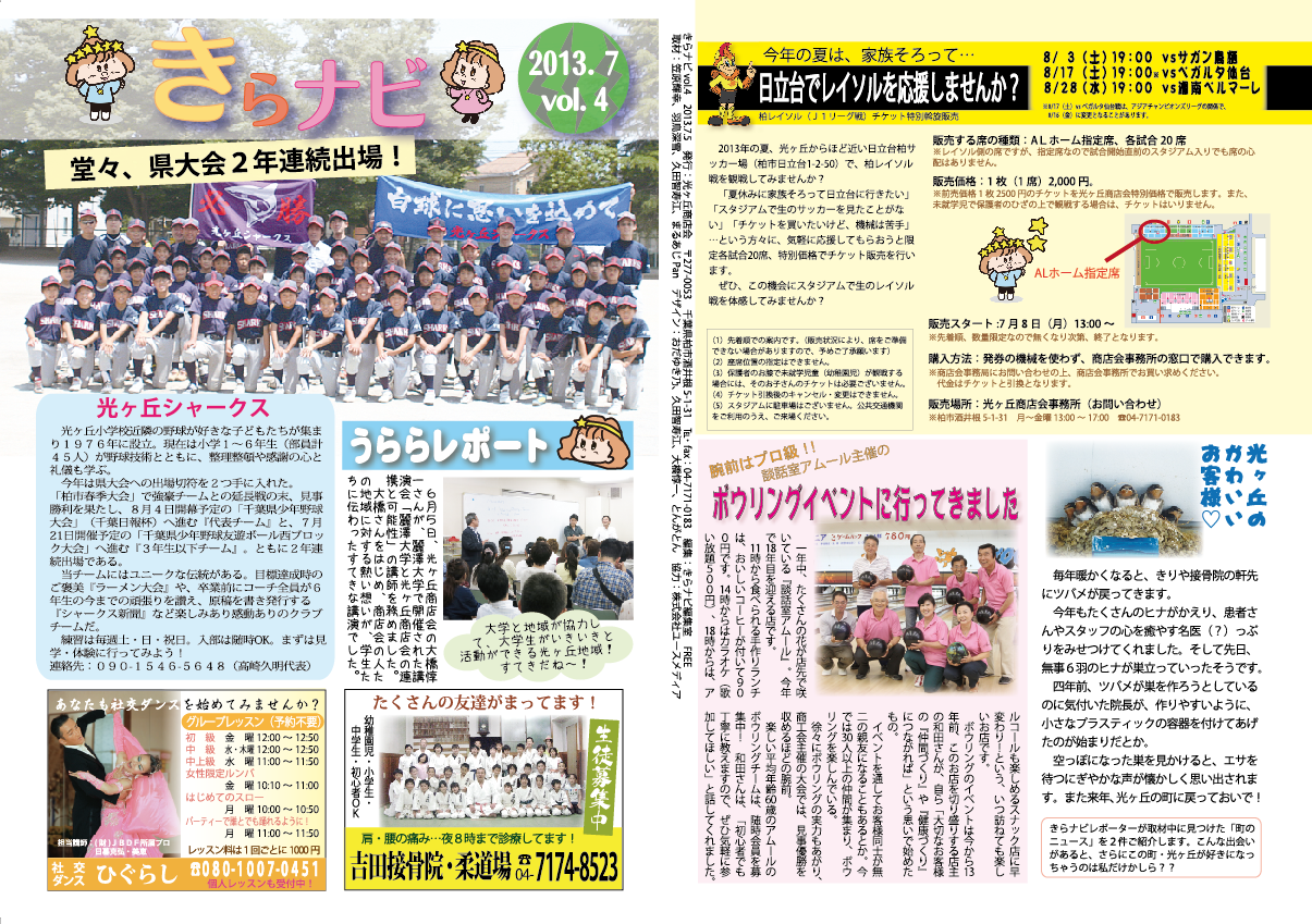 きらナビ情報発行履歴 きらナビ発行情報VOL4 KILANAVI VOL4 「皆んなの想いや活動があるから繋がれる」‥‥‥。 きらナビの成長記録です。 きらナビ Vol.04 4号は2013年7月に発行。 第2号に続き、光ヶ丘の少年野球チームが見出しを飾ってくれました。創設40年近くになる「光ヶ丘シャークス」はこの年、2つの県大会出場を決めました。 光ヶ丘シャークスにはユニークな伝統があります。 目標達成時の、ご褒美ラーメン大会や卒業前にコーチ全員が原稿を担当して書いて発行する「シャークス新聞」などユニークなクラブの一面も! PAGE TOP